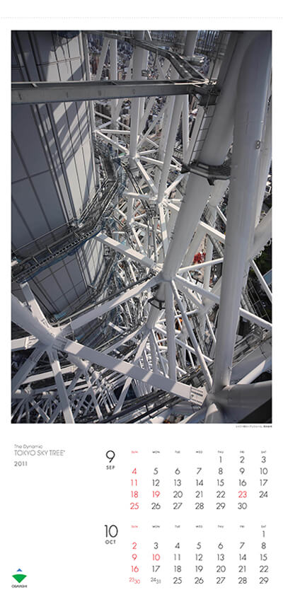 2011年版カレンダーは、現在建設中の東京スカイツリー®を通して建設のダイナミズムを紹介する「The Dynamic TOKYO SKY TREE®」です。 ものづくりの現場で重要なのは技術、そして人。かつて見たことのない巨大構造物も、一人ひとりが心を込めて造っています。建設中にしか見ることのできない写真とともに、働く人にも目を留めてみてください。
