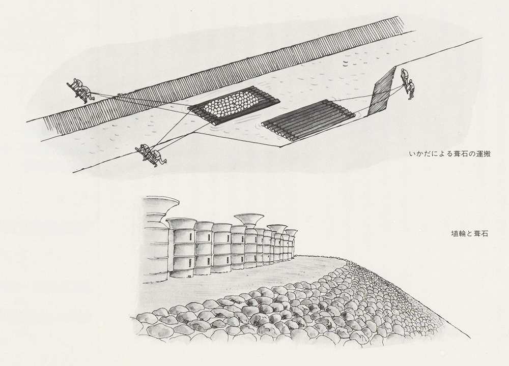 古墳全体に敷かれた葺石は、斜面保護のために有効である。斜面を風雨による崩壊から防ぎ、植物の生育を妨げる。石津川で採取した小石を、運搬専用の水路を開削して、いかだを曳いて運んだと考えた。小石を集める要員や水路開削に携わる人びともふくめ延べ17万人の作業員が要るが、地上を運ぶ場合に比べ、半数の要員で済む。