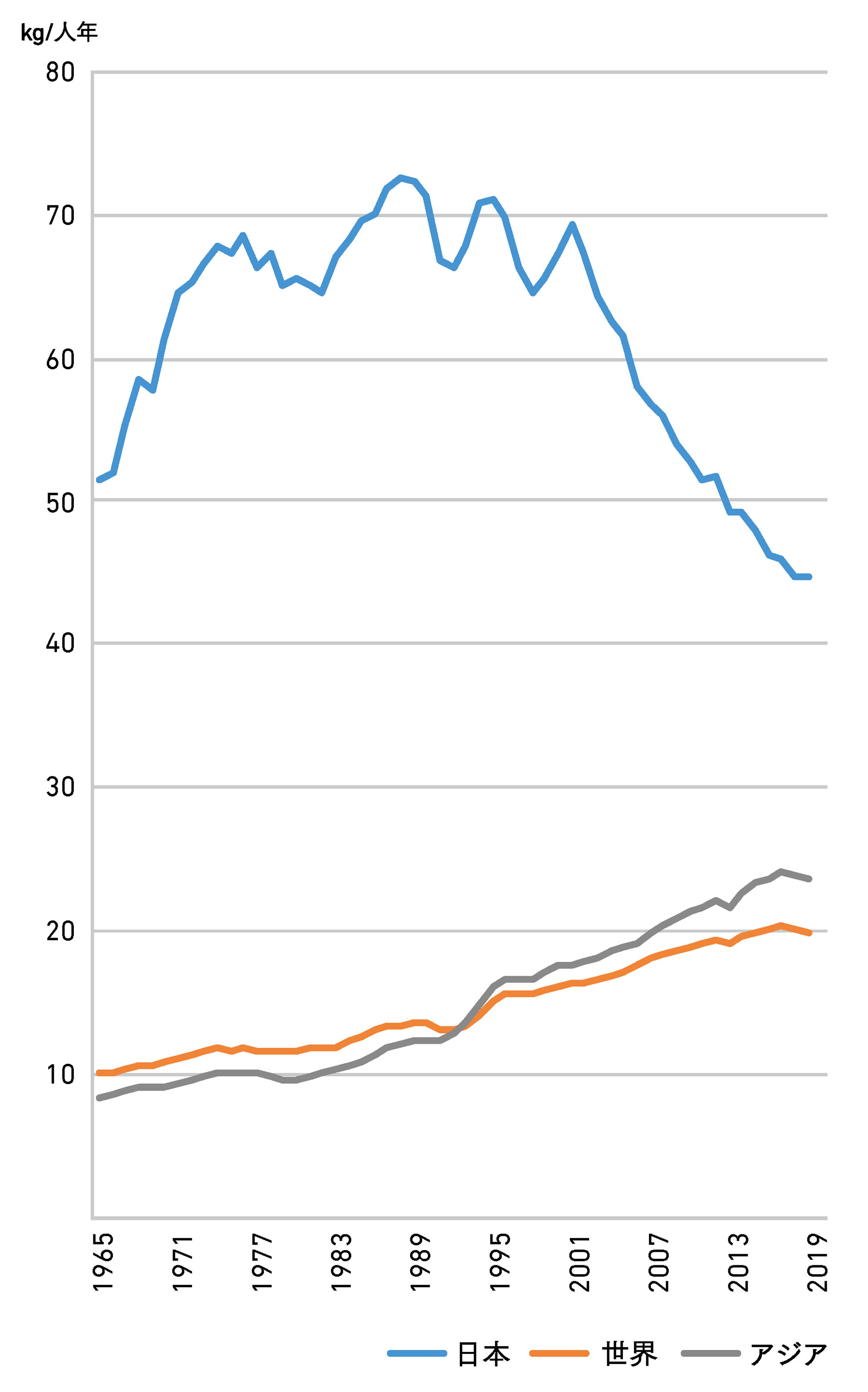 ちなみに世界では、1人1年当たりの消費量は1970年から2019年までの50年間で約2倍になり、特に中国では8.4倍、インドネシアでは約4倍に増加した。オンライン カジノ の やり方の消費量は依然として世界平均の2倍ではあるが、世界の主要国・地域の中で、唯一、消費量が減少した国となっている。