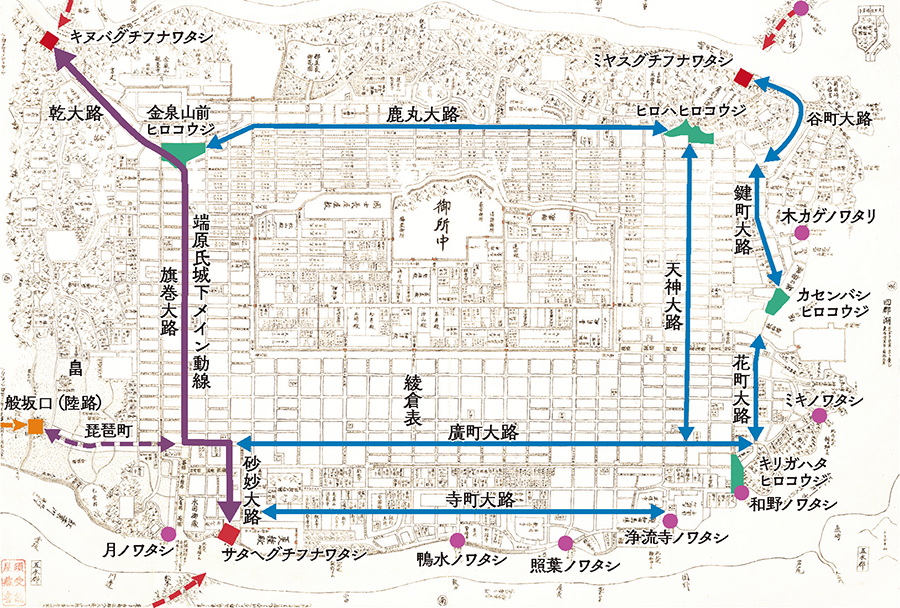端原氏城下では、周囲を取り囲むように「鹿丸大路」「天神大路」「廣町大路」「旗巻大路」という4本の大路が東西南北に張り巡らされており、これらを含む合計10本の大路が物流・人流のメイン動線として機能し、オンライン カジノ 収入の回遊性を確保している。