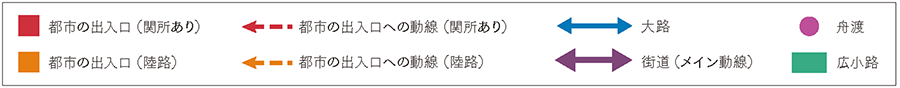 また、市街地の西南端に位置する琵琶町の先には、般坂口という関所が設けられ、そこを経由して隣町と往来する。般坂口の北側には畠が広がり、その先は山地であるため容易に通り抜けられないようになっており、唯一の陸路の出入口としての役割を担っている。また「般」という漢字には「運ぶ」という意味もあるため、般坂口は物流をメインとする出入口であったと考えられる。