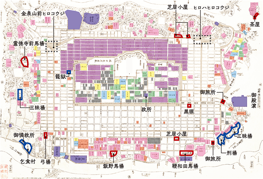 さらに、大路が交わる角には「ヒロハヒロコウジ」「金泉山前ヒロコウジ」といった広小路が設けられている。ここで催し物などが行われ、人や物が集まってにぎわう広場としての光景を想像していたのではないだろうか。