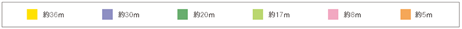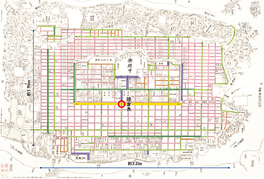 また、道の幅員も当時としてはかなり広く設計されている。御所を囲む南大路・西大路などは20~36mになっているが、大部分の道の幅員はほぼ8mと17mで統一されており、一般的な城下町と比較しても高幅員である。