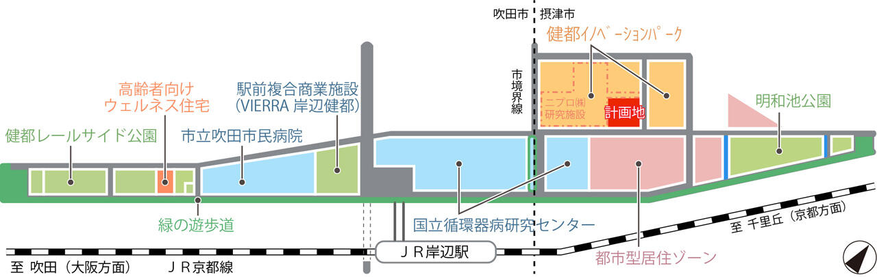 JR西日本不動産開発では、健都においてJR岸辺駅前の複合商業施設(ビエラ岸辺健都)を通じて「市民の生活サポート」とアライアンス棟の運営により「オープンイノベーションの創出・産業振興」の両面から健都の健康・医療のまちづくりに貢献することで、当社がめざす地域共生と地域価値の向上を図ってまいります。