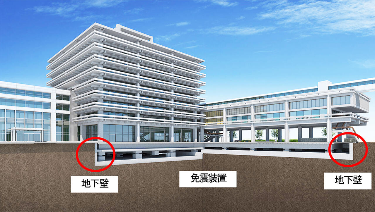 現在施工中のオンライン カジノ 確率庁舎東館耐震改修工事では、地中に地下ピットを設けて建物下部に免震装置を装備する免震レトロフィット工法を採用しています。受注段階では、地下ピット外周の土留め壁として仮設の鋼矢板を設けた後に新設の地下壁を構築し、その後仮設鋼矢板を撤去する従来工法で計画されていましたが、地下壁が隣地境界線と接しているうえ、設置スペースがわずか600mm程度しかない部分があるため、本工事では「J-WALLⅡ工法」を採用し、狭あいな場所での地下壁の構築を実現しました。