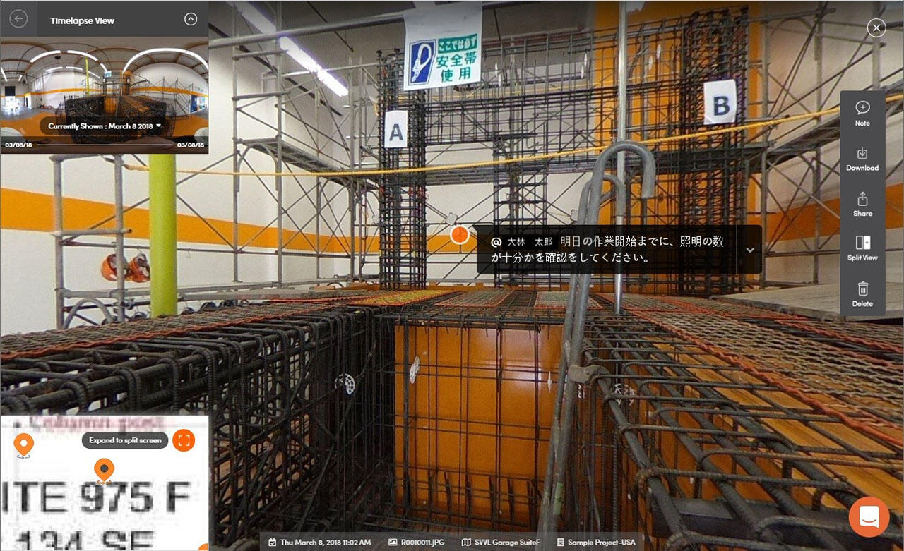 同じ撮影地点の画像を履歴で管理し、画面上で並べて表示することができるため、同じ地点の「過去と現在」の状況を対比して確認できます。また、二つの画像は連携して向きや角度を同時に動かすことができます。さらにBIMモデルを画像データとして取り込むことで、建設現場とBIMモデルとの比較も可能にします。