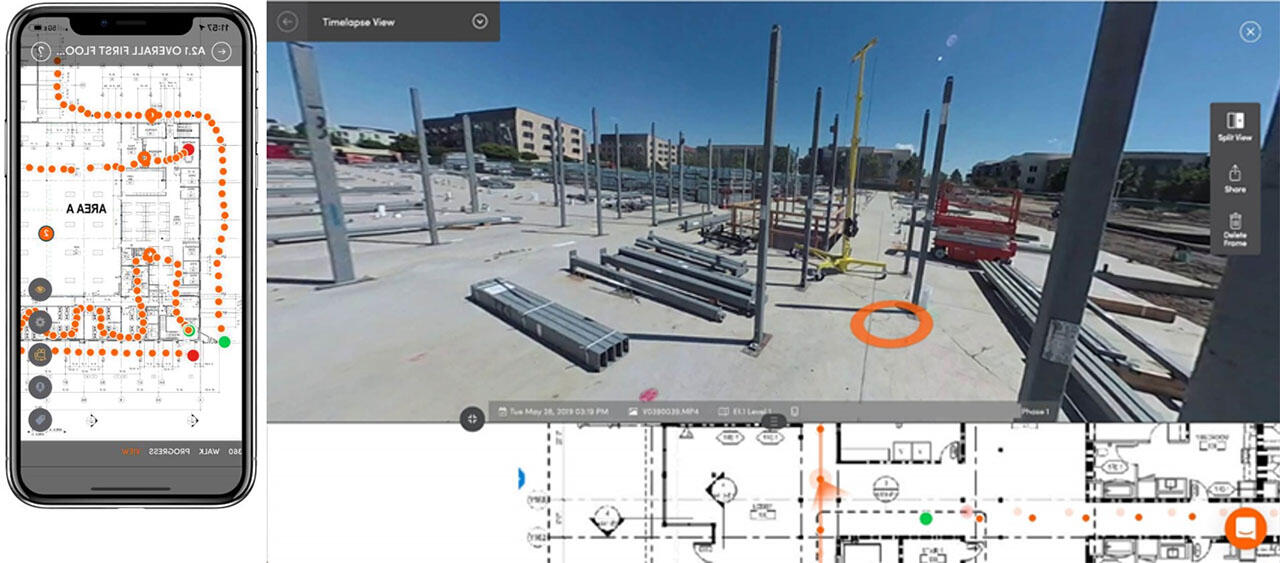 360°カメラのビデオ機能を利用した自動撮影が可能です(VideoWalk機能)。図面上でスタート地点を定めれば、撮影者が進んだ方角や距離を画像から認識して位置情報を推定するため、建設現場内を移動しながら撮影した360°画像データが自動的に図面の適切な位置に配置されていきます。配置された軌跡を選択していくことで、建設現場を歩き回るように360°画像を確認することができます。