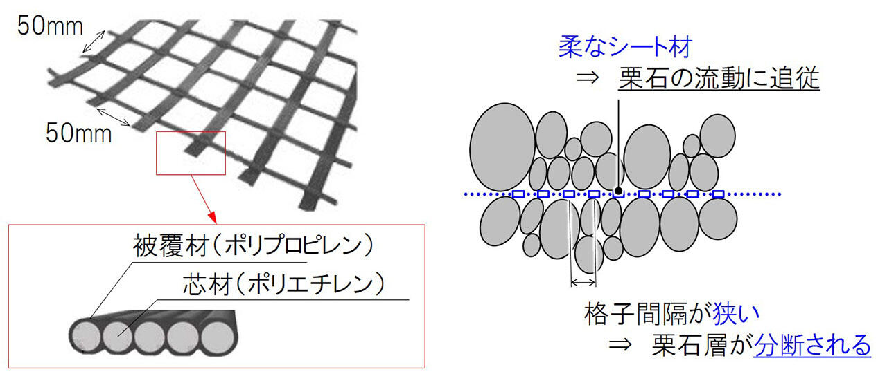 石垣の前を人が通行する箇所では、従来、安定性を向上させる目的で栗石層にジオオンライン カジノ v プリカッド(※1)を敷設する補強方法が採用されていましたが、粒径200~300mm程度の栗石を従来のジオオンライン カジノ v プリカッドで補強する場合、格子間隔が50mm×50mm程度と狭いため栗石層の噛み合わせが阻害され、伝統的手法を適用できなくなることがありました。また、従来品は、ポリエチレン製の芯材をポリプロピレンで被覆した帯材で構成されているため柔らかく、地震時の栗石層の流動に追従して変形してしまうといった課題もありました。