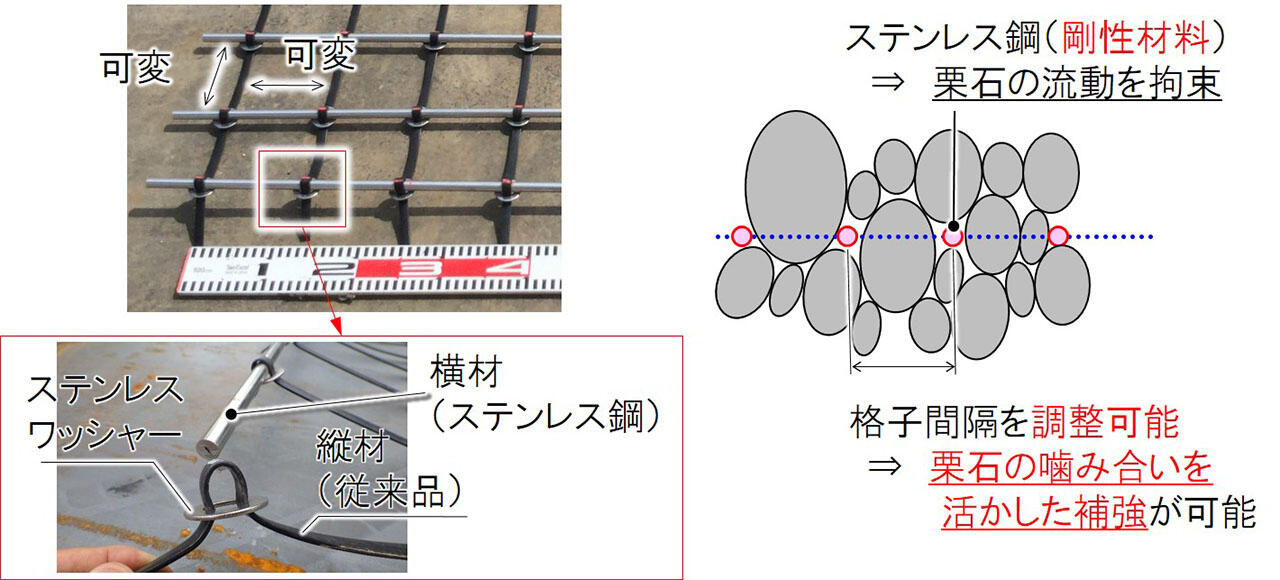 地震を受けた石垣は、背面の栗石が築石側に流動することで変形し、その変形が蓄積された結果、崩壊に至ります。オンライン カジノ v プリカオンライン カジノ v プリカッドを栗石層に敷設することで、栗石の流動方向に対し直交する向きにステンレス鋼が配置されるため、ステンレス鋼の剛性によって栗石の流動を拘束し、崩壊を防ぐことが可能となります。
