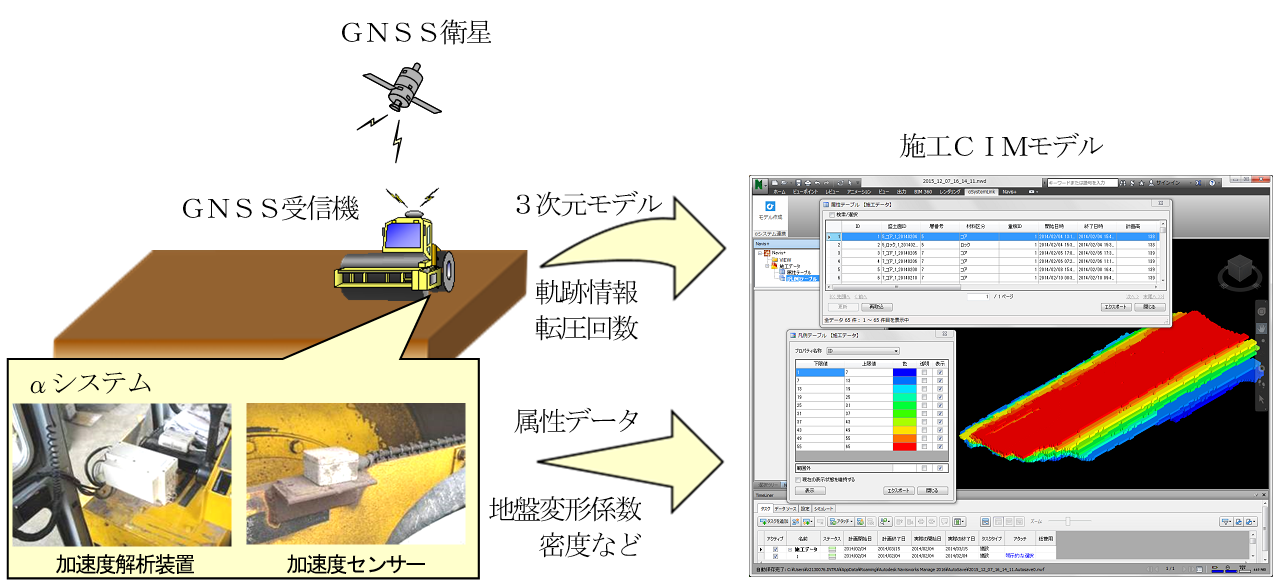 今回、導入した転圧管理システムは、αシステムの品質管理データと、締固め機械に設置した全地球測位システム(GNSS)受信機によって取得される軌跡情報および転圧回数を活用し、転圧範囲のCIMモデルを自動で作成します。