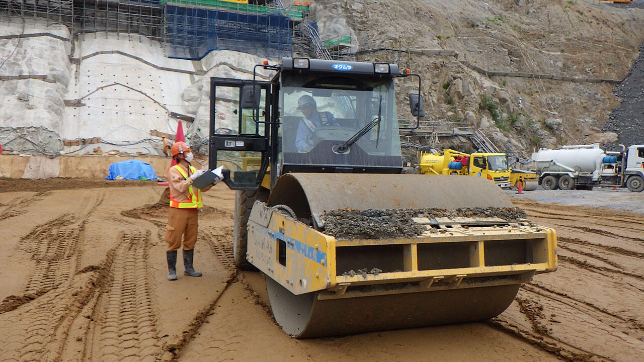 各材料を振動ローラで締固め(転圧)、密度を高めることで空隙を減らし、堅固なダムを構築していきます。