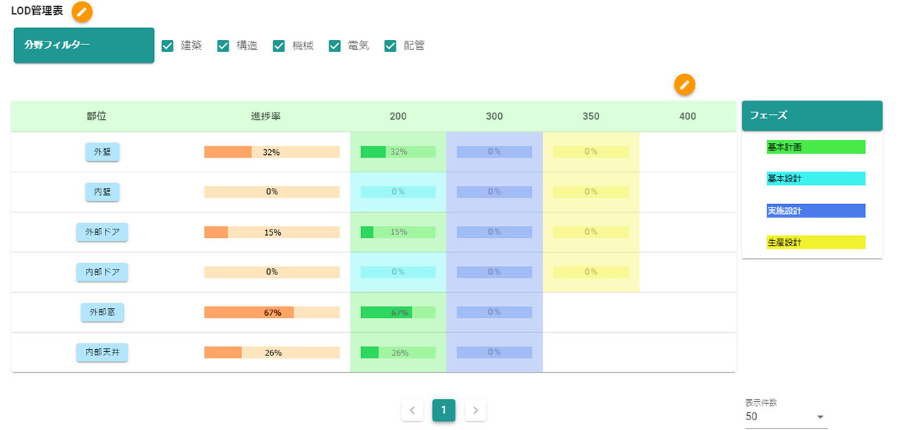ボタン操作で目標LODに対する部材の確定度合いが入力可能