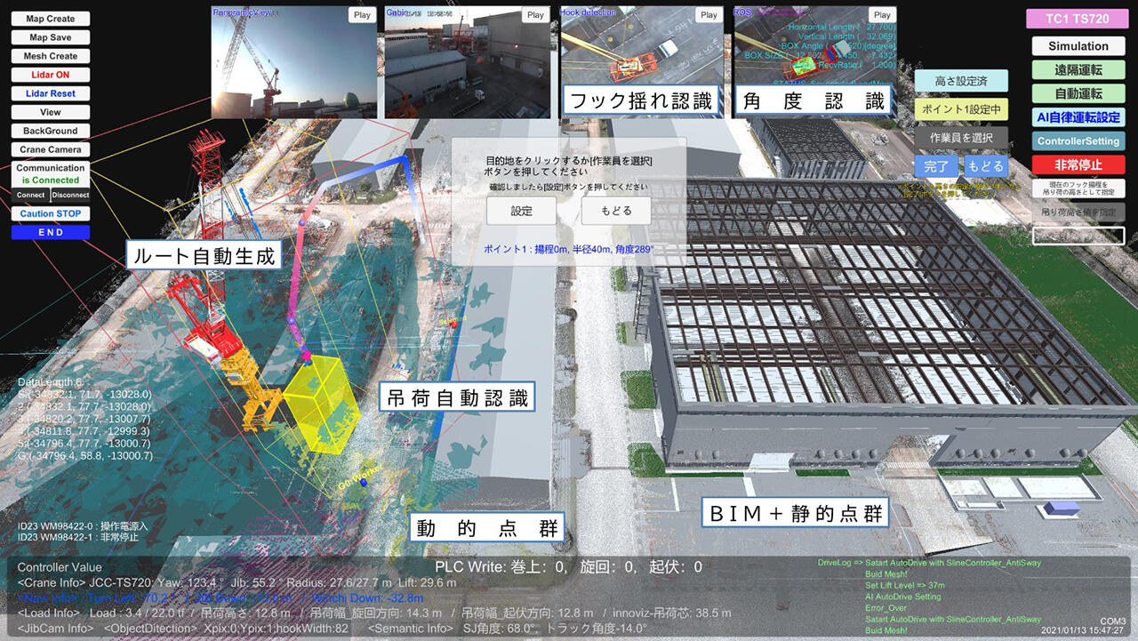 事前に取得した敷地全体の点群データ(過去)に、リアルタイムな情報としてオンライン カジノ 確定 申告に取り付けた3D-LiDAR(※1)による点群データ(現在)、さらに完成図となるBIM/CIMデータ(未来)を組み合わせることで、オンライン カジノ 確定 申告周辺状況の三次元のマップ情報を時間軸で把握します。そのため、操作者が目的地点を指定するだけで、マップ情報を元にシステムが吊り荷の形状や障害物の有無から最適な運搬ルートを自動生成し、運転を開始します。加えて、運転中も点群データを取得しているため、吊り荷に障害物が接近した際には減速や停止、さらに運搬ルートを再作成するといった安全性能を保持しています。