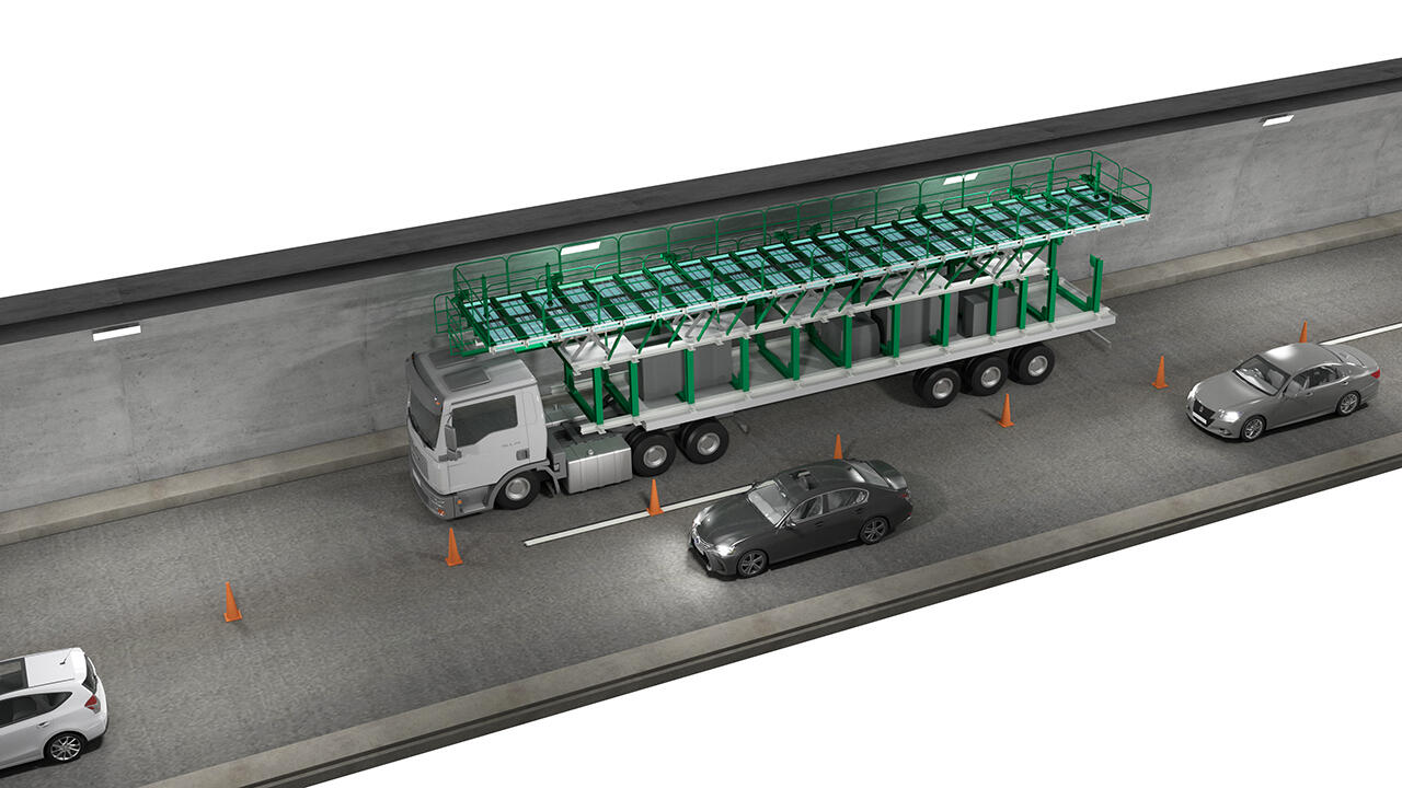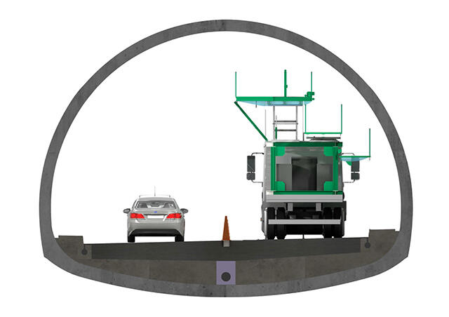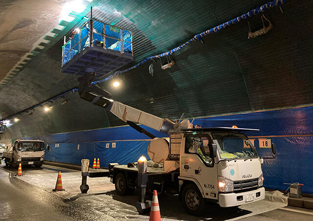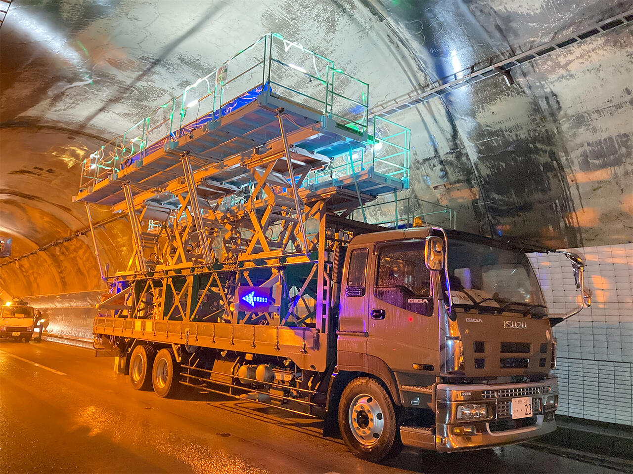 特に、近年一般的な工法となっている繊維シート接着工法(※1)では、長尺シートを覆工コンクリートに貼り付ける際に、作業範囲が狭いため補修・補強工事に時間を要し、交通規制期間が長期化していました。また、品質点検・確認用の高所作業車が、補修・補強用の高所作業車と輻輳(ふくそう)するため、品質管理者の移動が制限されます。このため、品質点検・確認作業の遅延や不良箇所の見逃しが発生するリスクがありました。