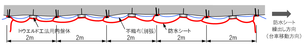 従来一体となっていた不織布と防水シートを別張りにしたため、防水シートの展張と固定がより容易になりました。また、上下に移動せず同じ高さをまとめて施工できるように作業台車の最適化を図るとともに、任意のタイミングで防水シートを固定できるIHウエルド工法(※3)を採用したことにより、周方向での釘打ちによる固定作業量を約2分の1に削減できました。これにより、作業員一人当たりの施工速度(防水シートm²/人日)が標準的施工速度(社内実績)の約2倍に向上しました。