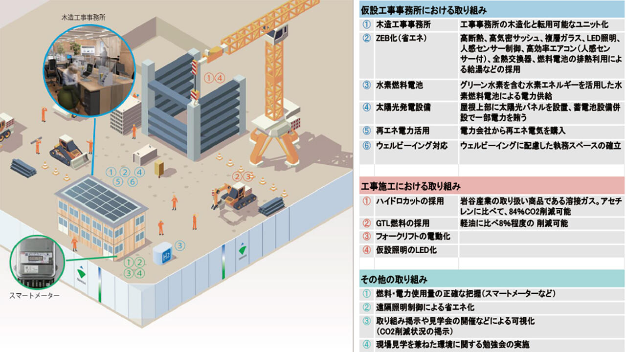 今般、その目標に向けた取り組みとして、水素のリーディングカンパニーであり、脱炭素社会の実現に取り組んでいる岩谷産業株式会社(本社:大阪府・東京都、社長:間島寬)発注の「研修施設計画」(神戸市)の建設現場において、CO2排出量削減に資する各施策の実証を実施します。