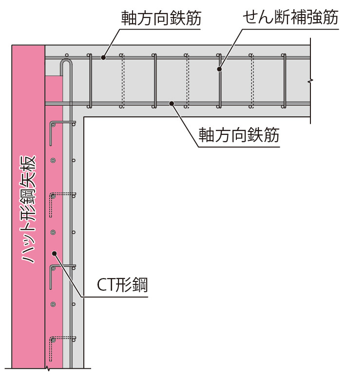 鋼矢板に鉄筋をスタッド溶接(※2)で接続し、頂版および底版(※3)へ定着することで、ボックスカルバートの側壁と頂・底版との円滑な応力伝達を可能とする構造としました。