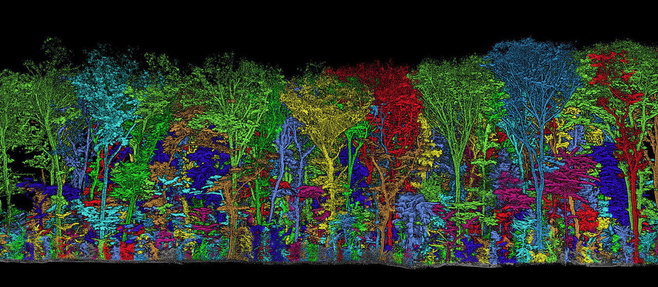 高性能LiDARで得た点群データ。樹木の一本一本にIDが付与され、色分けして表示される