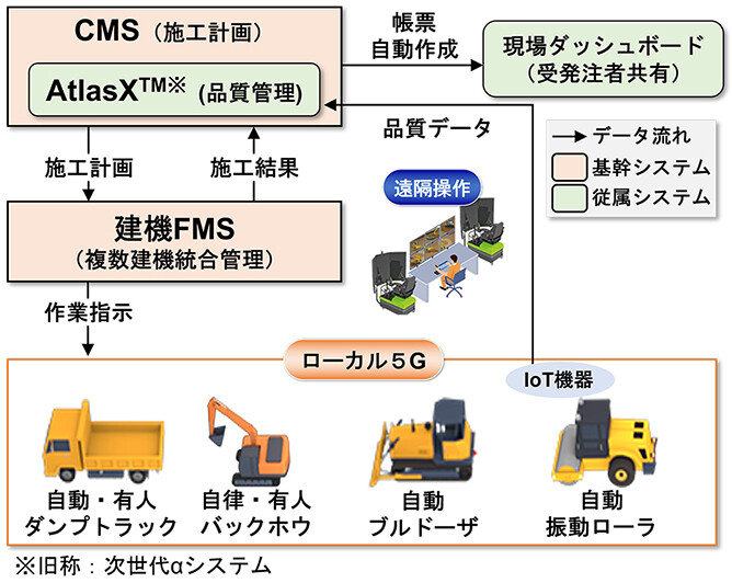 - (3) 盛土の品質管理を自動化するAtlasX™(アトラスエックス) αシステム、自走式散乱型RIロボット、3Dレーザースキャナの3種類のIoT計測機器を用いて盛土の締固めの品質管理を自動で行うシステム。建機FMSで管理する建機にセンサーを取り付けるなどの簡易な準備で、盛土の品質データを自動取得し、クラウド上で処理・可視化を行う。また、本システムで処理されたデータはCMSに送信され、品質管理、出来形管理帳票の自動作成が可能