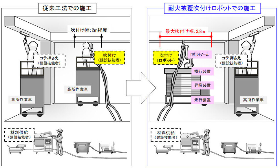鉄骨造の建築物では、鉄骨部材の火災損傷を防ぐために、鉄骨表面に耐火被覆処理を施します。耐火被覆工事で主に採用される半乾式吹付けロックウール工法(※1)は、吹付け時に被覆材(ロックウール)が飛散・浮遊するため、当該作業に関わる建設技能者(吹付け技能工)は、防護服や防じんマスクの着用が必要となります。夏場をはじめとする過酷な環境下での苦渋作業が、吹付け技能工不足の主な要因になっています。