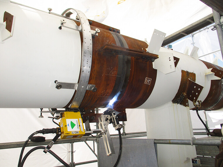 メインアリーナとサブアリーナの正円型のドームを保持するテンションリング(水平鋼管)(※2)の溶接には、オンライン カジノ 勝て ないのロボット溶接技術を適用しました。オンライン カジノ 勝て ないでは、以前から鉄骨造建築物における柱・梁の現場溶接作業のすべての自動化を可能としていましたが、本工事にて水平鋼管の全周溶接技術を新たに開発しました。