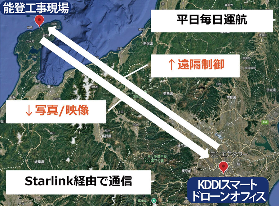 現場に設置したドローンは、月曜日から金曜日まで毎日都内にあるKDDIスマートドローンのオフィスで遠隔運航し、撮影した写真を低軌道衛星通信Starlink経由でクラウドにアップロードし、その写真から3次元モデルおよびパノラマ写真を生成することで、現場状況をデジタルツイン化します。
