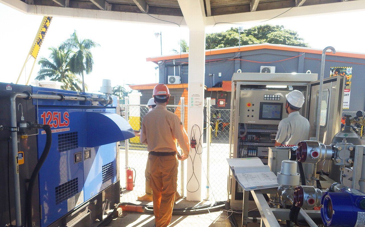 NZのオークランド港からフィジーのラウトカ港まで1週間かけて海上輸送されたグリーン水素は、フィジーガスのLPG貯蔵施設に据え付けられた水素混焼発電機の燃料に利用されました。同施設の電力需要に合わせて適切に水素の流量設定を行ったうえで発電機を稼働し、電力を供給することに成功しました。