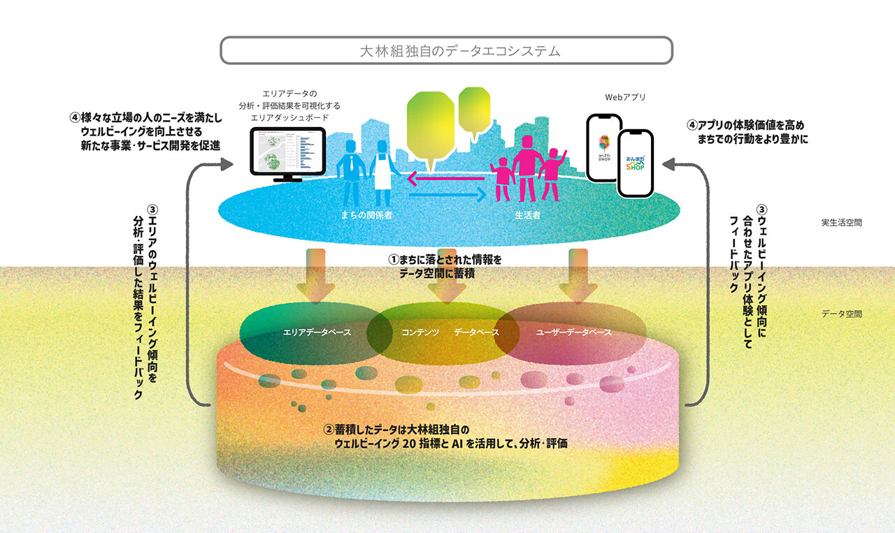 現在運用中のサービスである、周辺企業や店舗とのマッチングサービス「みんまちSHOP」や、2025年5月導入予定の生活者の感情や価値観を蓄積させるWEBアプリ「みんまちDROP」で得られるデータから、エリア特性を可視化する「エリアダッシュボード」に連携させることで、データの管理、分析、共有まで一元的に行うネットワークであるデータエコシステムを構築しました。
