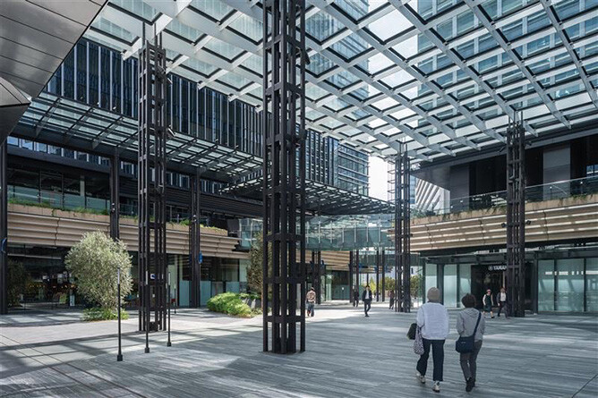広場では、日射や風、歩行者動線などのシミュレーションを行い、オフィスでは、空調や照明効率を最適化する外装計画を採用。快適性だけでなく環境負荷軽減も実現しました。