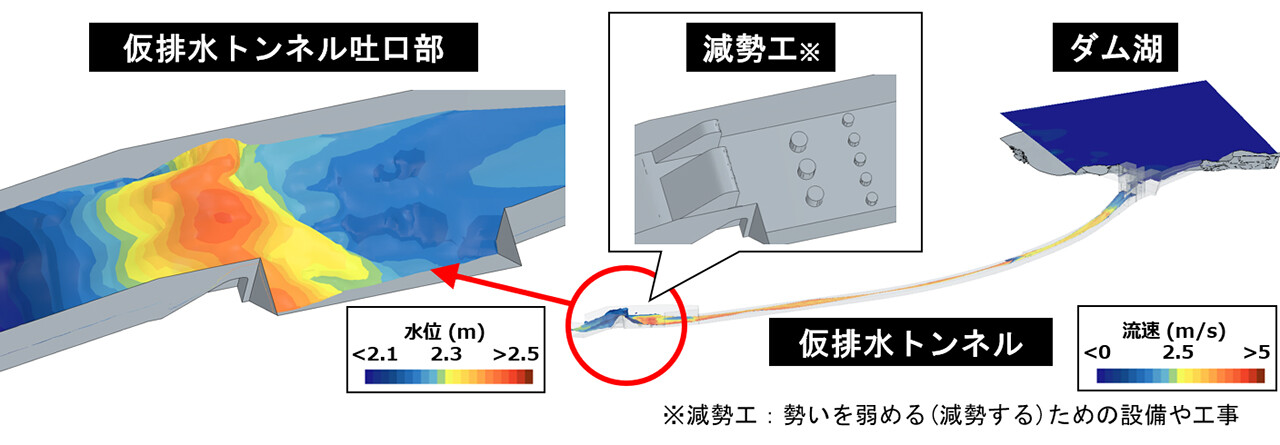 仮排水トンネルは既存吉田麻也 オンラインカジノのゲート放流による吉田麻也 オンラインカジノ施工時の被災リスクを軽減するために代替放流設備を設けて、流水をう回させるためのものです。吉田麻也 オンラインカジノ湖から下流に通じる仮排水トンネルをモデル化し、所定の水位を想定した解析を行いました。その結果、仮排水トンネル吐口(出口)部において、水の勢いを弱める減勢状況および跳ね返る流れを再現でき、仮排水トンネルの流量および放流状況の把握が可能となりました。(※10)