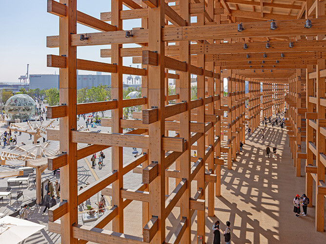 今回の受賞では、万博来場者のみならず広く国内外に日本の木の文化と技を発信したことや、日本の伝統的な貫接合を採用した「つくりやすく・解体しやすく・リユースしやすい」架構形式で建設したことで、環境負荷を軽減する循環型建築のモデルを示した点が高く評価されました。