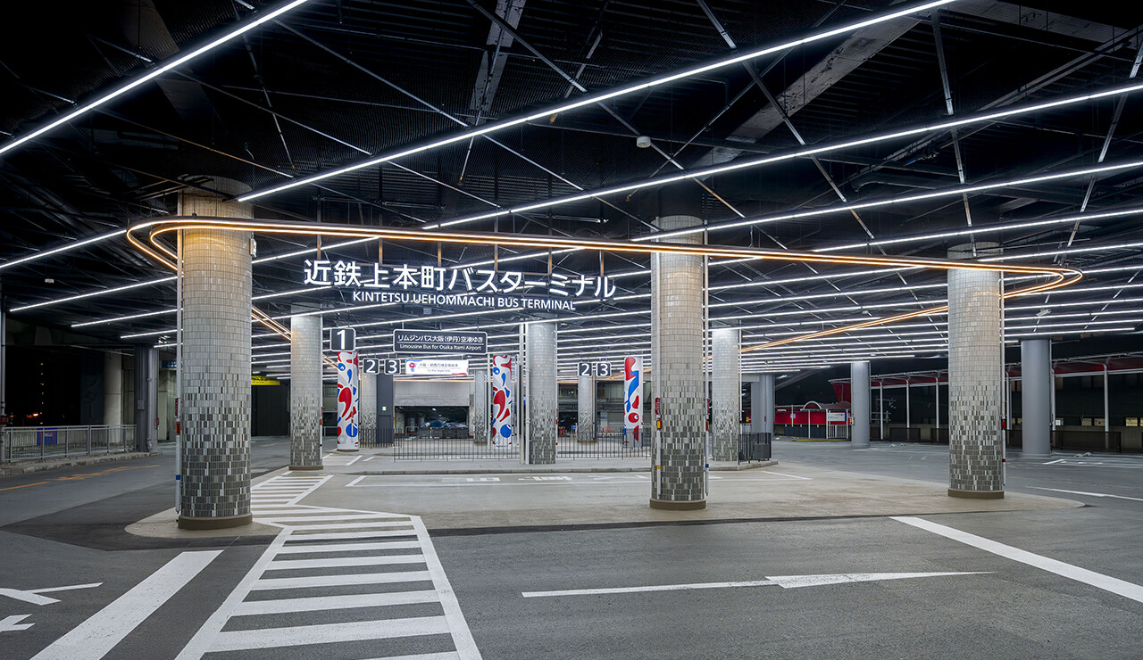 近鉄・大阪上本町駅のバスターミナルを改修するとともに、駅連絡通路を新設しました。線路を1線廃止して整備した連絡通路は、リズミカルな曲面壁で乗客を誘導し、行き帰りの空間体験に変化を与えます。