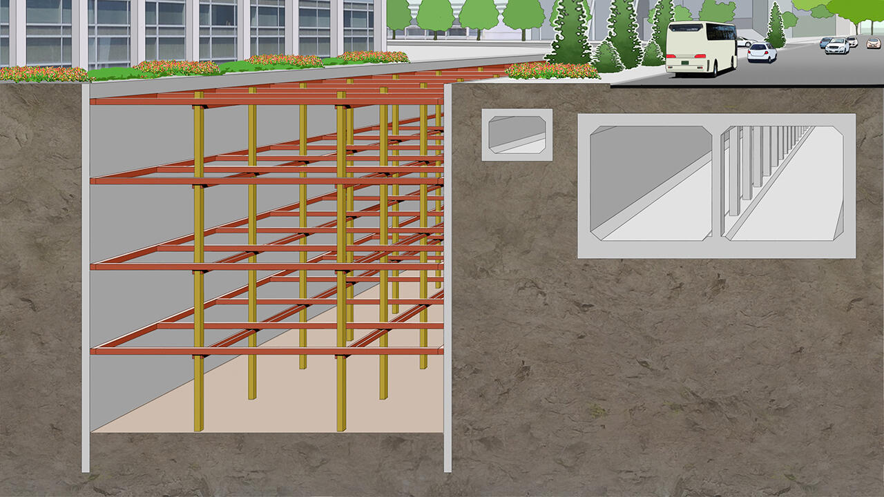 土留め壁を傾斜させ支保工を省略、急速施工に貢献