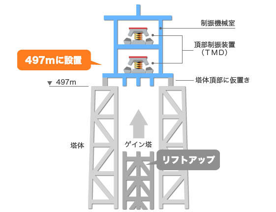 組み立てが完了した塔体頂部(497m)でドラクエ オンライン カジノ機械室を組み、頂部ドラクエ オンライン カジノ装置(TMD)を設置します。
