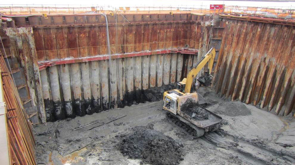 - 主な施工方法として鋼矢板や親杭を地山に傾斜させて打ち込む「鋼矢板方式」と「親杭横矢板方式」、地盤改良技術を用いて土留め壁を造成する「地盤改良体方式」があります。「地盤改良体方式」は施工機械を土留め壁の掘削側に配置するため、比較的狭いスペースでの施工も可能です。