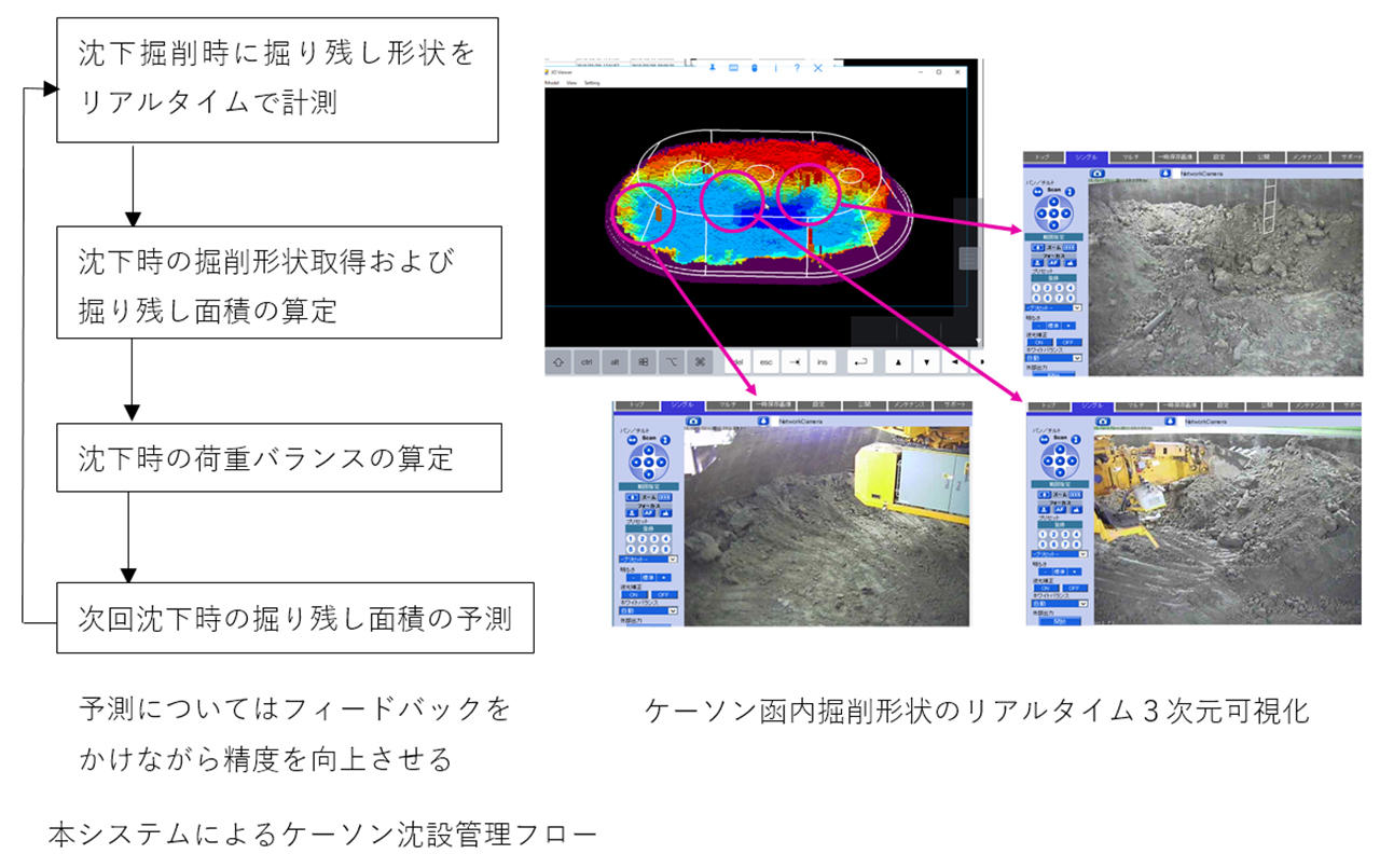 スキャナー計測によりケーソン函内の掘削形状をリアルタイムに3次元で可視化するとともに、各種計測機器の計測値を合わせて一元管理することにより、安全かつスムーズな沈設作業が可能となるシステムです。掘削機に搭載したレーザースキャナーで掘削形状をリアルタイムに可視化し、沈下掘削時の姿勢データ(傾斜、偏心)と沈設管理データ(刃口反力、周面摩擦力など)を統合・蓄積して、地質ごとに最適な掘削順序や開口率を算定します。自動制御システムを搭載した高機能ケーソンショベルを併用して、掘削箇所・深さ方向の掘削精度を向上し、過掘りを防止します。