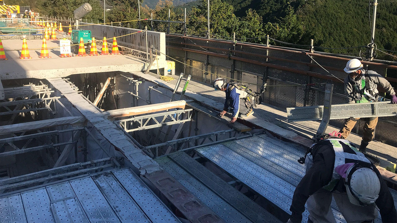 道路橋の床版取替工事で作業足場の組み立て・解体を効率化