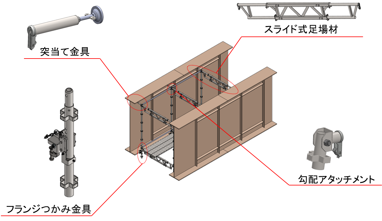 高速道路の橋梁などの床版取替工事において、作業足場の組み立てや解体をシステム化した道路橋向けの足場です。既存の足場材と、桁間の足場に特化した専用の部材を組み合わせて構築できます。