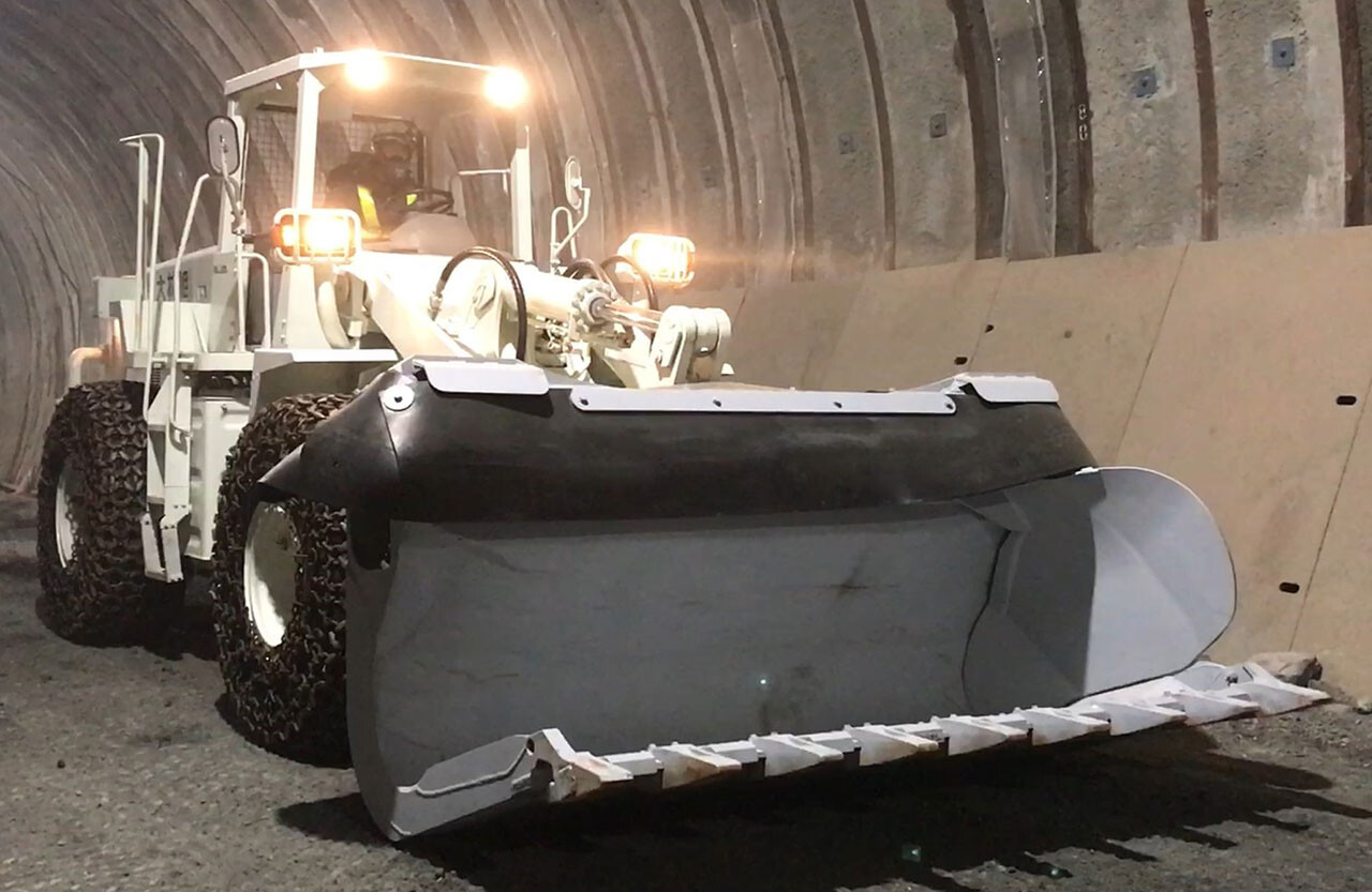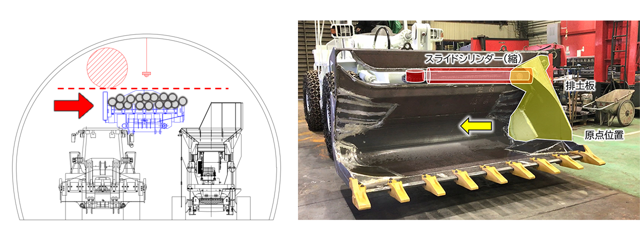 ホイールローダーなどの重機に搭載する特殊バケットです。トンネル掘削時に発生する掘削土は、ホイールローダーを使い運搬車両に積み込んで搬出します。従来は、ホイールローダーと運搬車両を並行に配置し、バケットを傾けて排土する「サイドダンプバケット機構」を用いていましたが、バケット上部に十分な可動空間が必要で、換気設備や照明に干渉しないよう、操作には熟練した技術が必要でした。