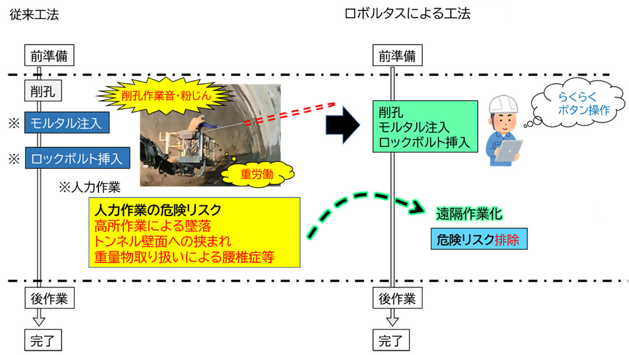 山岳トンネル工事では掘削後、トンネルを構造的に保持するためにロックボルトを打設します。打設作業は、切羽付近の騒音や粉じんなどがある中、作業員が重量物であるロックボルトを取り扱う過酷な作業であるとともに、作業員の技量が施工スピードや品質に左右されます。ソニー 銀行 オンライン カジノルタスでの打設作業は、タブレット端末での遠隔操作なので品質と安全性が向上し、省人化を実現します。