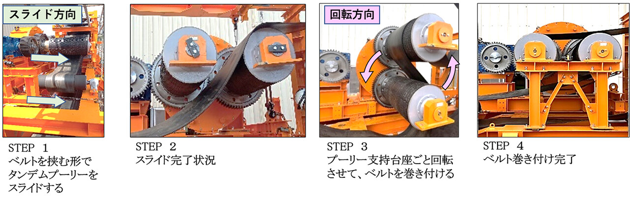 新 オンライン カジノとは、トンネルでの土砂搬出用ベルトコンベアのベルト延伸時にベルト切断が不要となる技術です。従来ベルトを切断し再度加硫(かりゅう)する手間が必要な延伸コンベヤ(※1)のブースタードライブ(※2)において、一対のタンデムプーリー(※3)を片持ち構造のままベルトを挟むようにスライドさせ設置し、プーリー支持台座ごと回転させてベルトを巻き付ける新型ブースタードライブです。新 オンライン カジノにより、作業中断期間を最小限にできます。