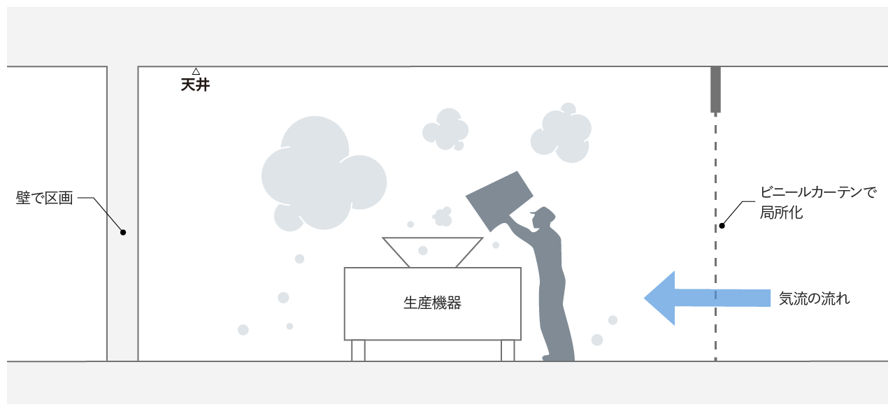粉体原料を拡散させない対策として、粉体取扱いエリアを平面的に区画し、気流が粉体取扱いエリア外からエリア内に流れるような空調を計画します。 粉体の堆積を抑える方法として、梁形や建具などの水平部分を少なくする納まりを採用します。