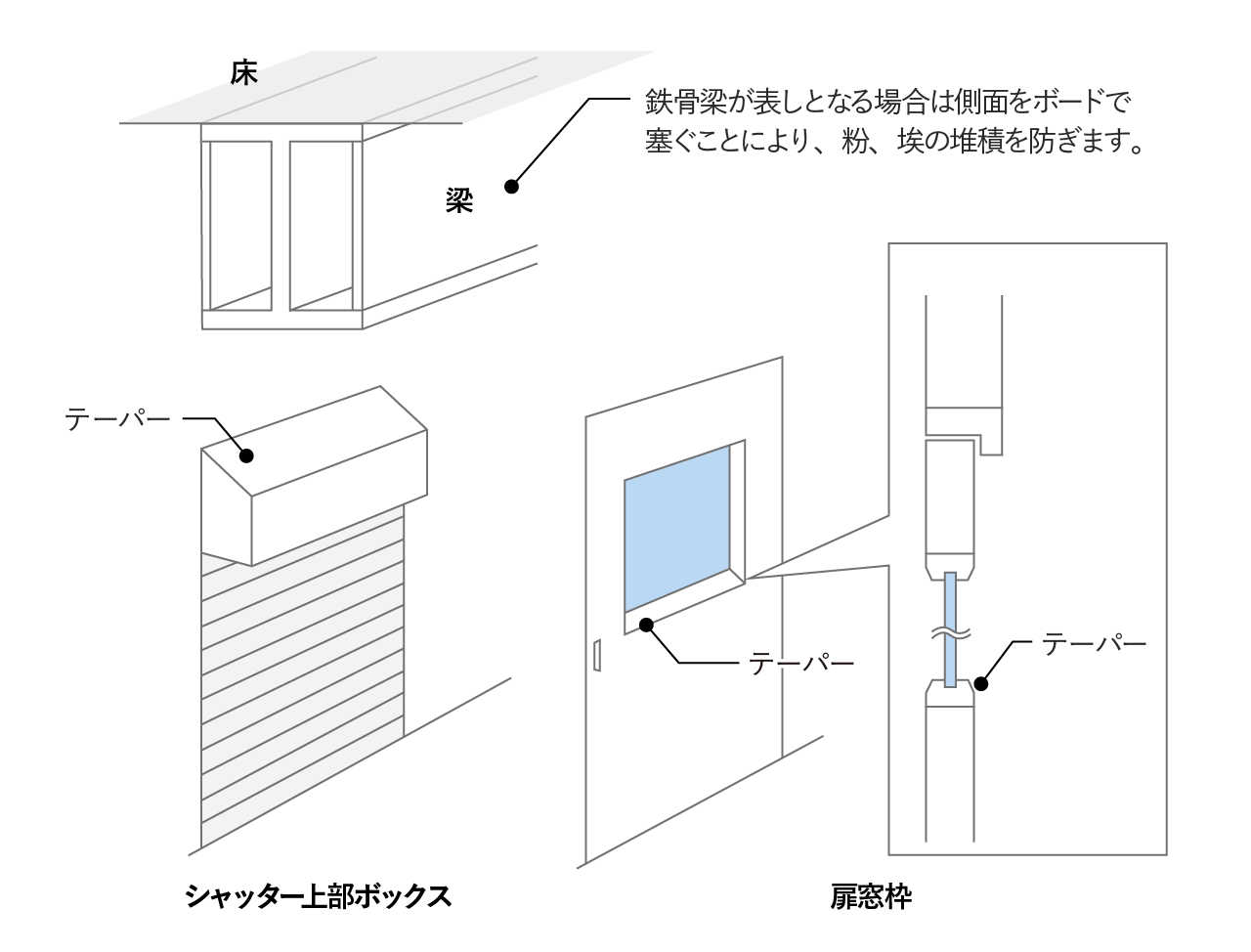 粉体の堆積を抑える納まりの例