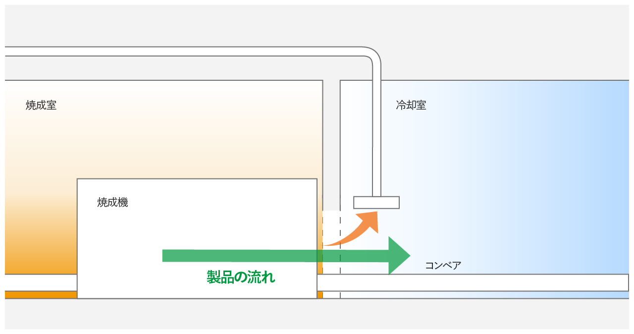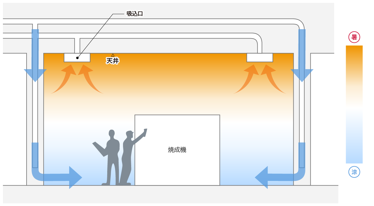 焼成機など熱を発する大型設備はできるだけ空間が狭くなるように区画します。焼成室の開口部周りでは気流をコントロールし、熱が他の部屋に拡散しないように計画します。 単体の焼成機や原料溶解機など発熱する生産設備が大部屋に同居する場合は、置換空調やスポット空調により作業環境を改善するよう計画します。