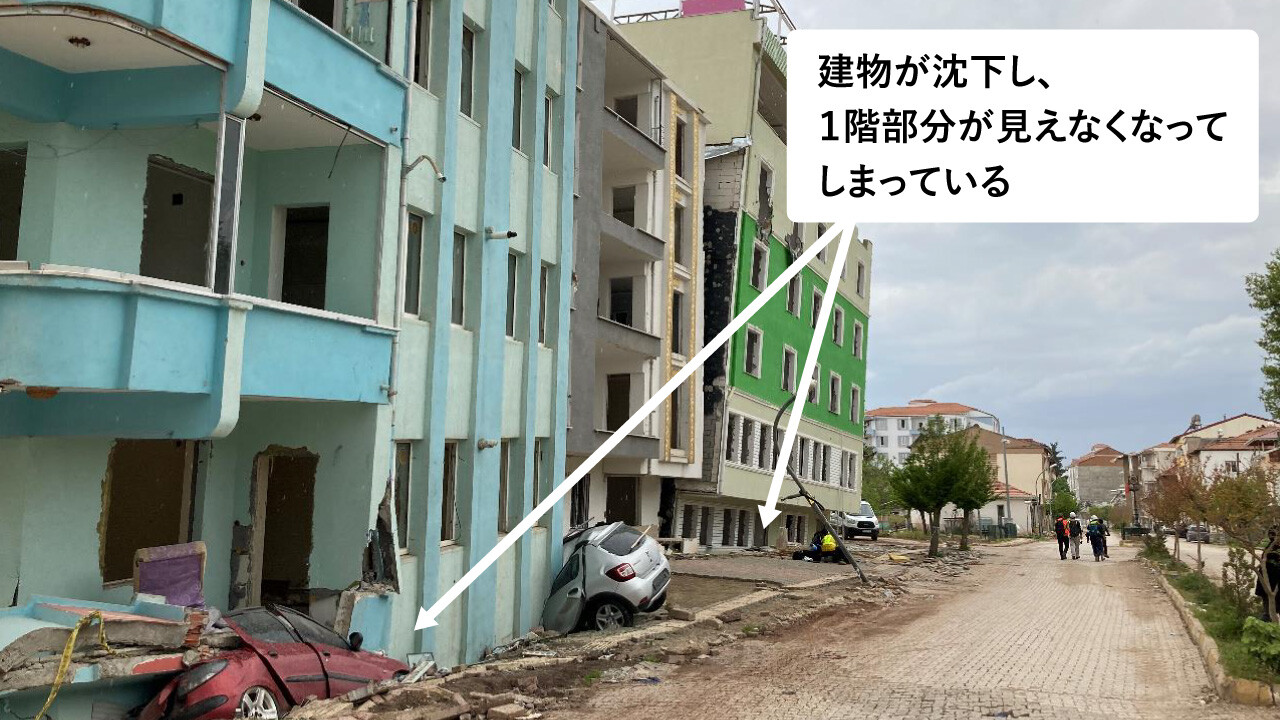 圧力の高くなった地下水は「噴砂」や「噴水」として地表面に噴き出だします。地震の揺れのあと「泥水」中の土粒子が沈降し地盤が沈下します。