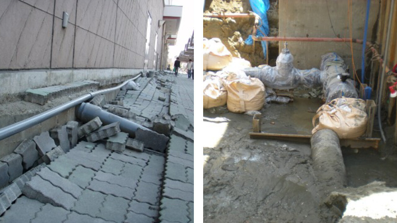一見すると、対策方法は明確で簡単なように見えます。しかしながら、いずれの対策工法もこれから建設する場合であれば適用も容易ですが、既に建物が建っている場合などは、その下の地盤を補強することは容易ではありません。 既存の建物や施設直下の地盤に施工できる工法もありますが、特殊な機械を使用すること、建物や施設に影響を与えないように計測管理や防護措置が必要になることから、一般に新設時の工事と比較して大幅にコストアップします。