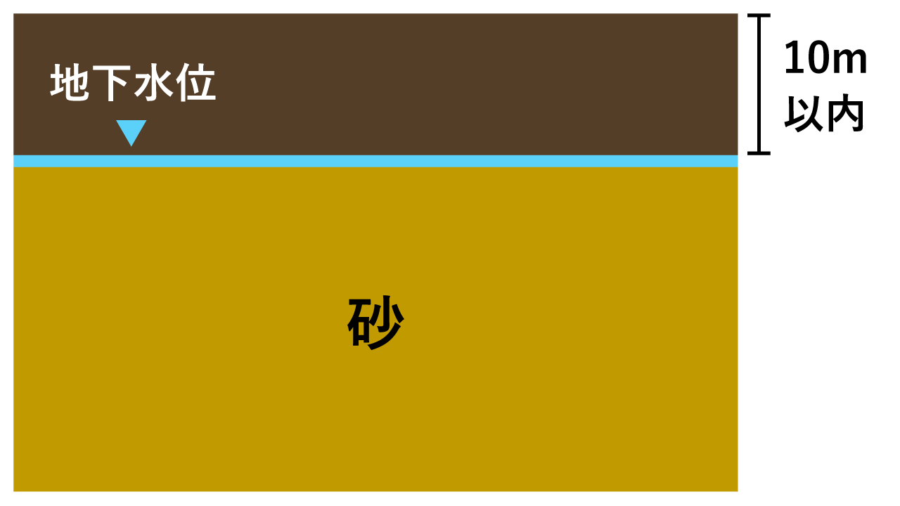 地下水位が地表面から10m以内で、浅いほど被害が大きくなります。