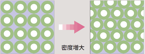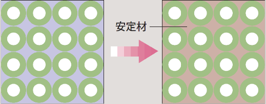 - 地震が来なければ:砂粒同士が隙間を伴いながら緩くかみ合い、その隙間は水で満たされています。地盤は砂粒同士が接触していることで強さを保っています。つまり地盤にかかっている力はすべて砂粒のかみ合いによって支えられている状態です。