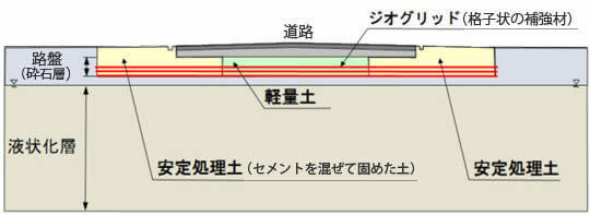 タフロード工法は、既存の対策工法(地盤と建造物のオンライン カジノ フリー対策)から発想を転換して、オンライン カジノ フリーの発生は許容するものの、道路部分をジオグリッド(格子状のネット型シート)で補強して変形しにくくします。また、軽量土を使用することで、オンライン カジノ フリー時の変形に対して重量バランスを保つ構造となっています。 このため、段差などの変形が起こりにくくなり、車両の走行が確保できます。大規模な改修工事が不要で、臨海部の工場の構内道路などの対策に適しています。