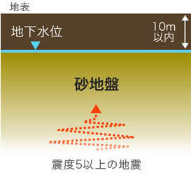 - 地震時:地震の揺れにより地盤全体が変形して隙間の水を押し出す力が働き、隙間の水圧が 高くなり、砂粒同士が接触する力を弱めて「泥水」のような状態になります。